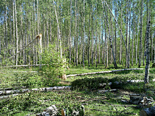 Kotiseudulla sattui olemaan myrsky käydessämme siellä vierailulla. Jälki oli monin paikoin melkoista (kuvat vähän heikkolaatuisia, koska en ollut muistanut säätää uuden luurin asetuksia kuntoon eikä kunnon kameraa sattunut olemaan mukana kun eihän nyt mitään ihmeellistä voi tapahtua).